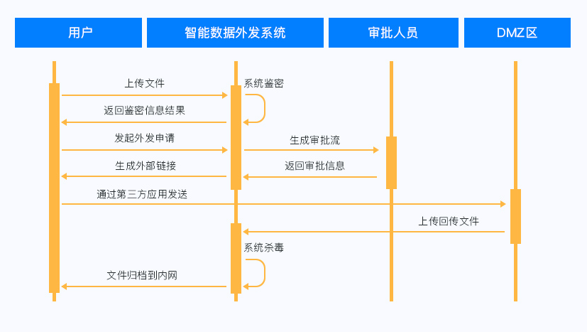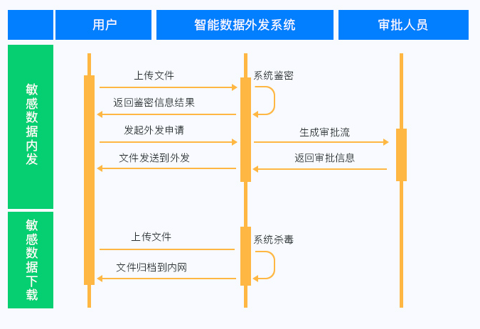 敏感数据内网导出到外网——内网数据经系统鉴密且通过流程审批后,文件发送到外网,内部用户可外网登陆使用。