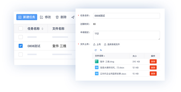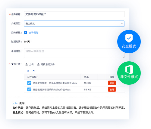 文件外发支持安全模式、源文件模式;系统默认外发客户文件有效期为审核通过后的60天。