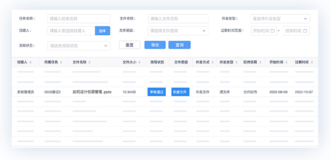 支持可按任务名称、文件名称、外发类型、创建人、文件密级、过期时间范围、流程状态审计查询系统中外发文件的状态。