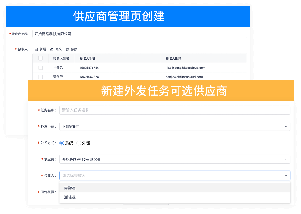 系统有独立外部供应商账号管理,系统发起流程时需选择供应商库中的账号。