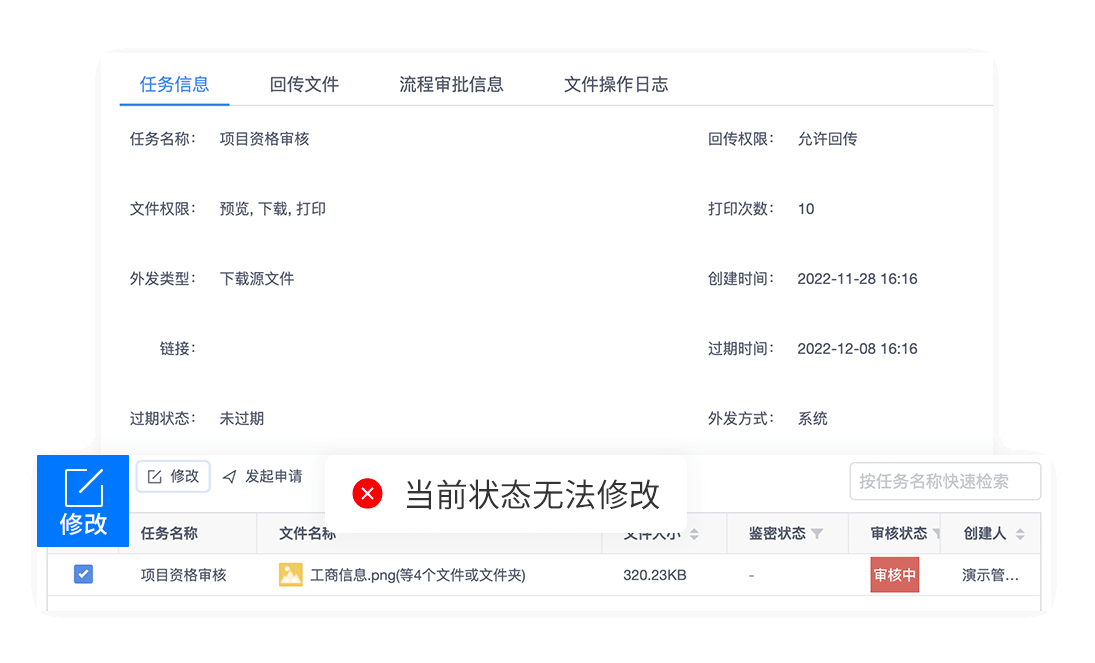 文件发起流程,字段数据不可变更,保护文件不被随意修改。