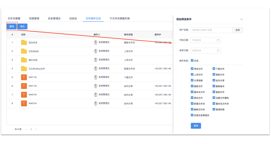 管理员可以选择用户范围、时间范围、操作类型筛选查看目录下用户的操作行为